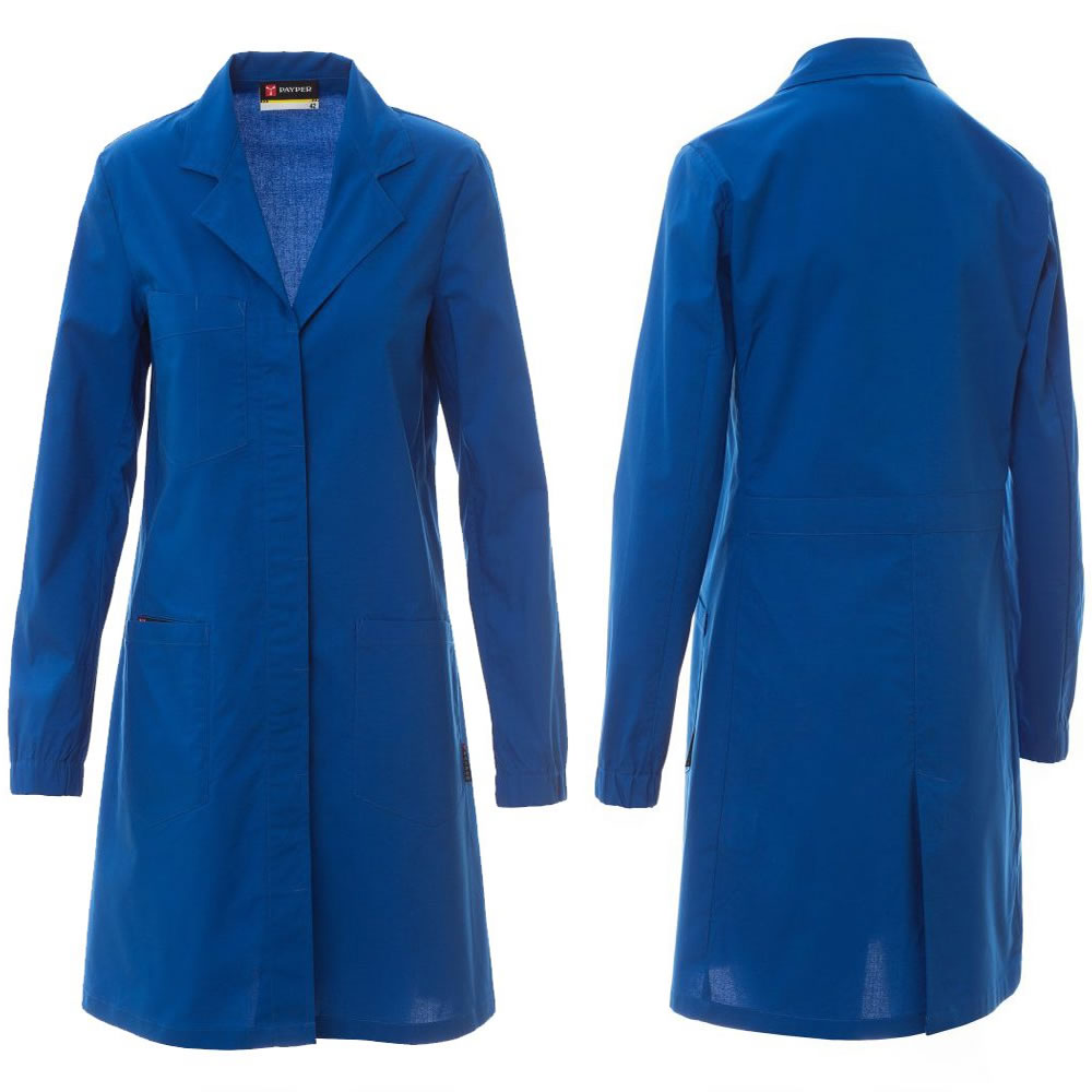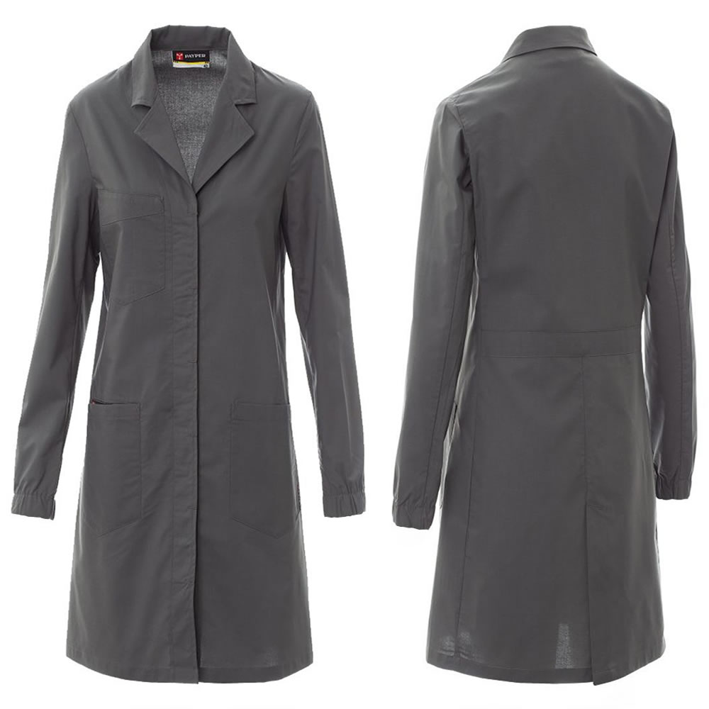 Bata para mujer con cuello con solapas clásico, cerrada en el delantero con botones automáticos, botonadura cubierta, un bolsillo aplicado a la altura del pecho con compartimento para bolígrafo, dos bolsillos aplicados a la altura de la cintura, un pequeño bolsillo para teléfono móvil, espalda con canesú liso, abertura en la espalda para facilitar los movimientos, manga larga con puños ajustables con elásticos.