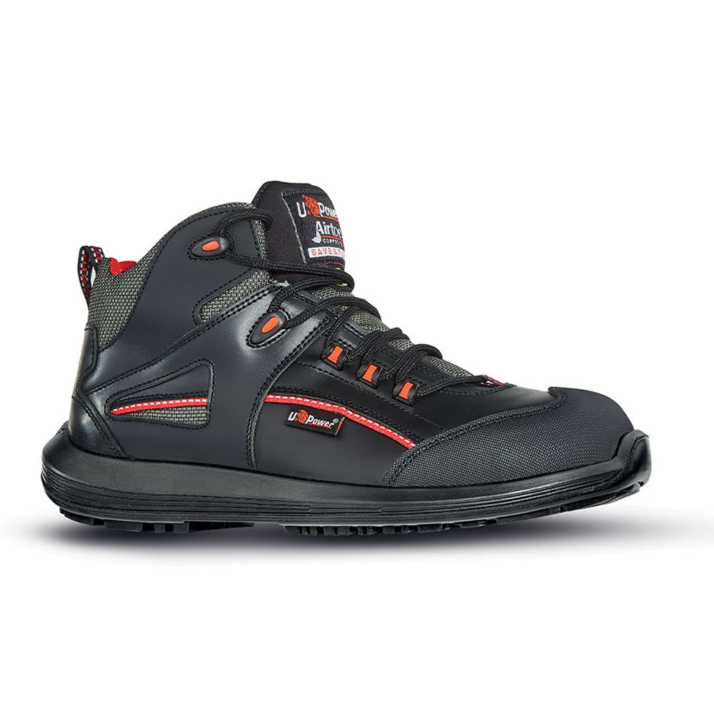 Zapados de seguridad botines totalmente «metal free», cómodos y ligeros U-Power de la línea Rock&Roll, con empeine en suave piel lleno flor, hidrófugo protección de punta en MATRIX antiabrasión, con inserciones en Mesh traspirable, puntal AirToe Composite, antiperforación, antideslizante y suela PU/PU.