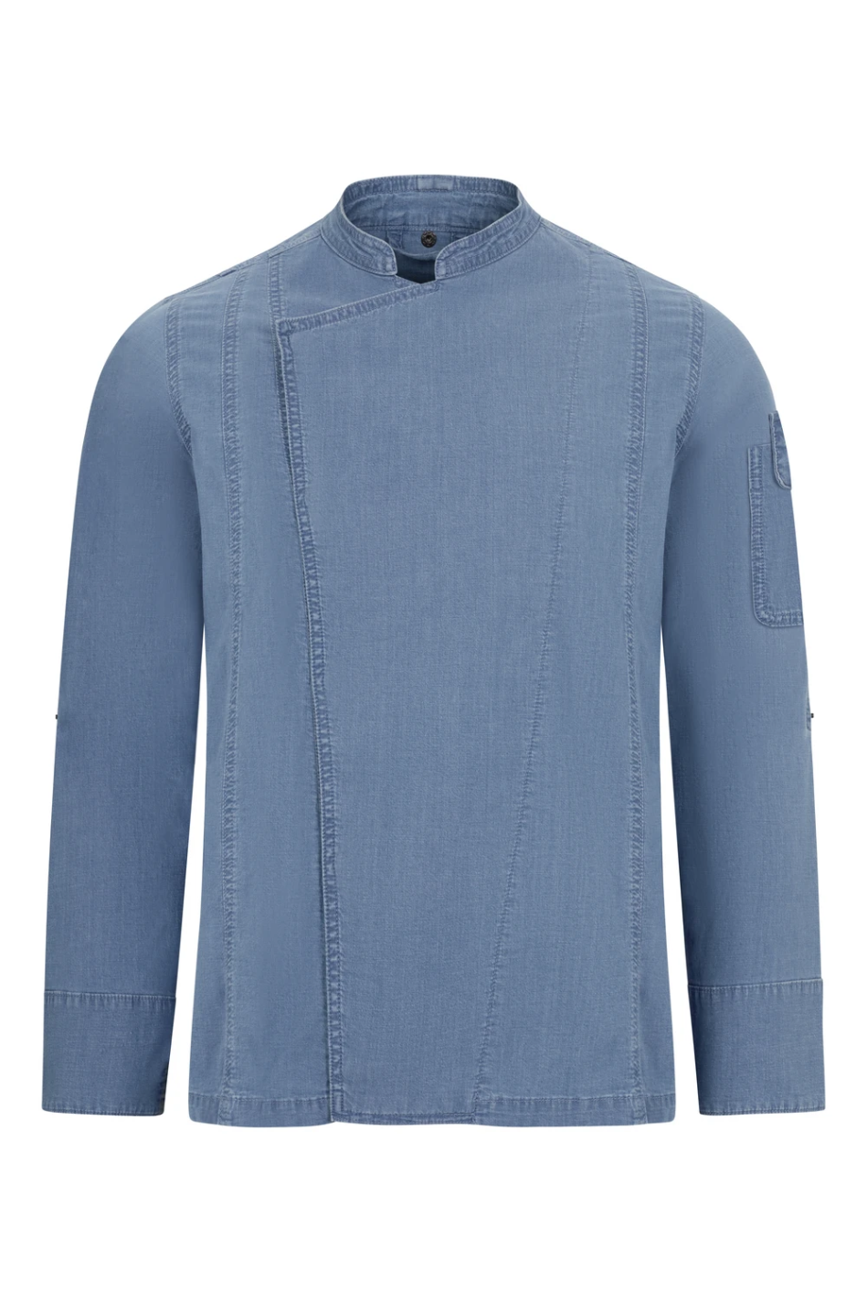 CHAQUETA DE COCINA DEMIN 405212S VELILLA Cierre central asimétrico con botones automáticos ocultos.